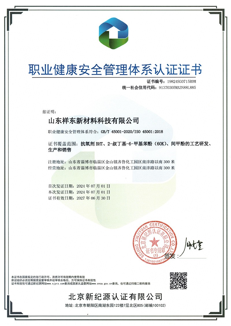山東祥東新材料科技有限公司1.2萬噸/年6-叔丁基鄰甲(60K)、4-叔丁基鄰甲酚(偏 24 酚)和 4,6-二叔丁基鄰甲酚(偏 246 酚)烷基甲酚項(xiàng)目竣工環(huán)境保護(hù)驗(yàn)收監(jiān)測(cè)報(bào)告