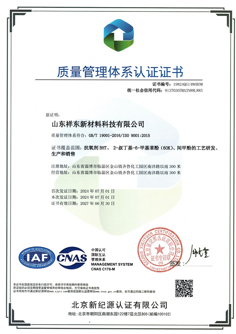 山東祥東新材料科技有限公司1.2萬噸/年6-叔丁基鄰甲(60K)、4-叔丁基鄰甲酚(偏 24 酚)和 4,6-二叔丁基鄰甲酚(偏 246 酚)烷基甲酚項(xiàng)目竣工環(huán)境保護(hù)驗(yàn)收監(jiān)測(cè)報(bào)告